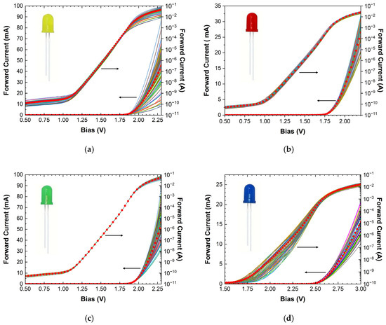 Forward I-V characteristics in both linear and semi-log plots of a hundred (a) yellow, (b) red, (c) green, and (d) blue LEDs. The red circles in all graphs depict the average behavior.