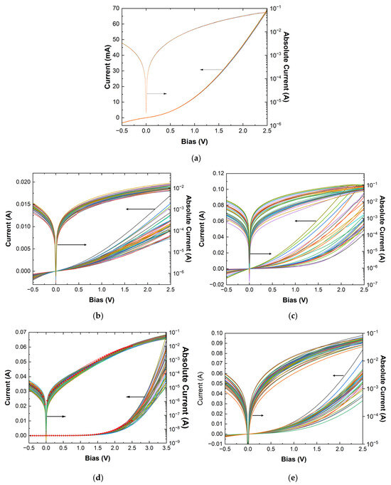 (a) I-V characteristics of a randomly selected medium-size device from the RU-0.5 wafer were repeatedle measured eight times, and heerin presented in a linear and semi-log plot. Differences are not discernible even at the semi-log plot. I-V characteristics both in linear and semi-log plots of 40 medium-size devices from wafers (b) RU-0, (c) RU-0.5, (d) RU-1.0, and (e) RU-2.0. Red circles in (d) depict the I-V characteristic of a random medium-size device of RU-1.0 measured over 7 years ago when the devices were fabricated.