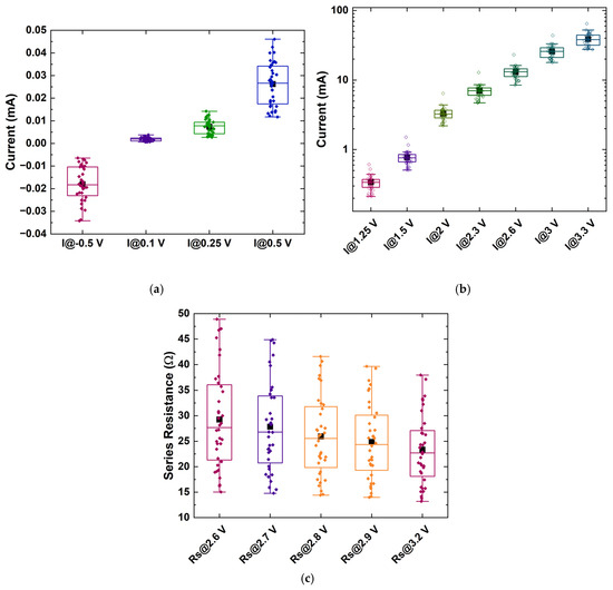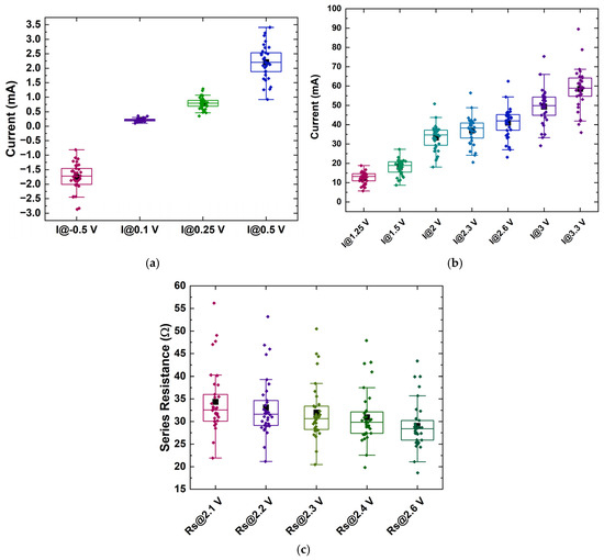 Distribution of (a) currents at a reverse bias of −0.5 V and within the low-bias regime, (b) currents within the high-bias regime for sample RU-1.0, and (c) series resistances at various voltages within the high-bias regime. The rectangular boxes indicate the values between 25% and 75% of the maximum obtained value. Also, a few outliers can be observed. Black squares indicate the mean value, while horizontal lines within the boxes mark the median value.