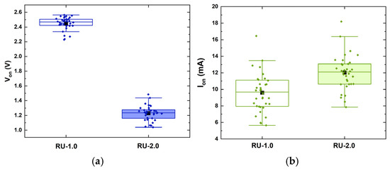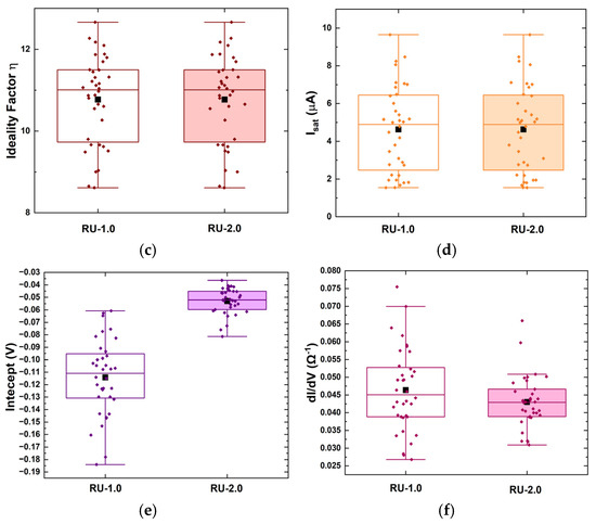 Distribution of (a) the turn-on voltage Von, (b) the current at Von, Ion, (c) the ideality factor η, (d) the saturation current Is, (e) the intercept, and (f) the slope of the linear region dI/dV of both RU-1.0 (clear rectangles) and RU-2.0 samples (shaded rectangles). The rectangular boxes indicate the values between 25% and 75% of the maximum obtained value. Black squares indicate the mean value, while horizontal lines within the boxes mark the median value.