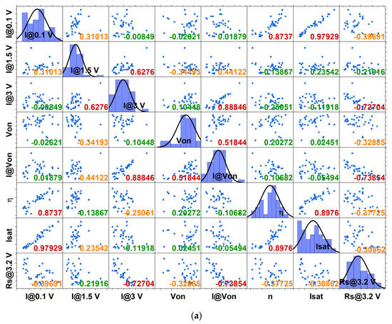A similar study for the RU-2.0 device statistics was performed, and the results are summarized in an analogous way in Figure 8 and Figure 9. Following the same method–procedure, it was observed that currents are more dispersed (Figure 8a,b) but also more correlated than in the RU-1.0 homojunctions case. The series resistance, as in the case of RU-1.0, demonstrated the same degree of variability (Figure 8c) and high correlation (Appendix A), and only one can be selected as a unique identifier. As a result, two or even one current (at a specific bias) can be selected for comparison, most preferable at low voltages. The rest of the parameters selected for the final comparison were Von, the slope in high biases, the ideality factor η, and series resistance (at high bias).