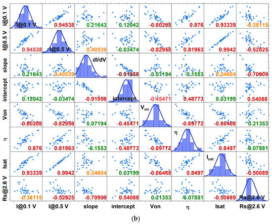 As expected from the I-V plots, in the case of the RU-1.0 devices, low currents -for biases up to 1.25 V—have similar behavior, including the reverse bias currents (Figure 7a). This was further verified using the correlation coefficient between any two of them (Appendix A). Thus, from this region of bias, only one current can be exploited as a unique identifier, while the rest can be considered redundant. Currents at higher biases tend also to exhibit similar behavior to each other (Figure 7b), having a high correlation (Figure 10a); thus, one value of current at this region can again be useful, and the same stands for the series resistances (Figure 7c). Also, Von can be extracted from the currents measured above 3 V (Figure 9a), as well as the current at Von, Ion, Figure 9b), while the ideality factor and the saturation current can be extracted from the values around 1 or 2 V (Figure 9c,d, respectively). Finally, it was seen that the intercept and the slope exhibited high variability (Figure 9e,f, respectively) and could be employed as identifiers. Overall, one needs to choose parameters (the identification parameter set) that have as low correlations as possible to each other in order to constitute the identity of each sample.