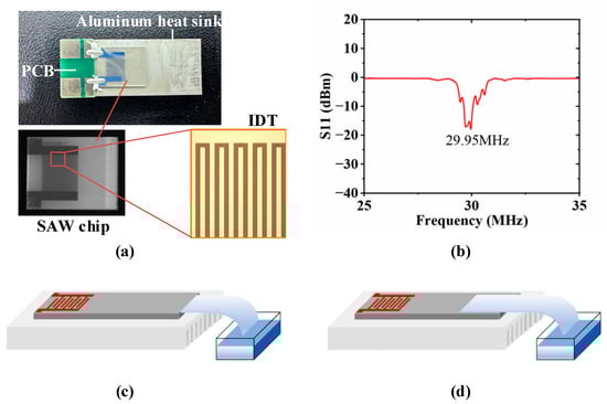The Rayleigh SAW chip, with dimensions of 10 mm × 8 mm × 0.5 mm, is fabricated using a low-loss piezoelectric substrate: 0.5 mm thick 128° Y-cut, X-propagating single-crystal lithium niobate (LiNbO3) wafer. A 5 nm titanium/150 nm aluminum interdigital transducer (IDT) is patterned on the LiNbO3 substrate via standard photolithography and lift-off techniques, as depicted in Figure 1a. The straight-finger IDTs adopt a standard linear structure with equal electrode width and spacing (both 33.25 μm), 30 electrode pairs, and a 4 mm aperture. Consequently, the SAW wavelength (λ) o is 133 μm (four times the electrode width), and the excited SAW response frequency (fr) is 30 MHz, calculated by the relationship fr = cs/λ, where cs ≈ 3990 m/s is the characteristic phase velocity of Rayleigh wave propagation along the 128° Y-X LiNbO3 substrate []. To extend the lifetime of the SAW atomizer, we fixed the SAW chip on the upper surface of an aluminum heat sink with dimensions of 30 mm × 12 mm × 4 mm using nano silver adhesive, as detailed in our previous literature []. Additionally, a 0.5 mm thick printed circuit board (PCB) with two pads is attached to the aluminum heat sink parallel to the SAW chip. The pads are electrically connected with the bus electrode of the IDT through conductive silver glue, and an RF signal matching the operating frequency of the SAW device is input into the IDT to excite SAWs on the surface of the piezoelectric substrate. The measured frequency response curve of the fabricated SAW atomizer by a network analyzer (E5063A, Keysight, Santa Rosa, CA, USA) is shown in Figure 1b, showing that the actual operating frequency of the device is 29.95 MHz and the return loss is about −20 dBm. Although slight deviations exist between the actual operating frequency and the theoretical design value due to inherent fabrication process variations, their impact on experimental research is negligible and can be ignored.