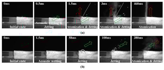 Atomization process of deionized water supplied by a paper strip with an input voltage of 800 mV. (a) PSLEA atomization mode, (b) PSLSA atomization mode. The green hollow arrow indicates the droplet jetting direction, and the red hollow arrow indicates the atomization direction.