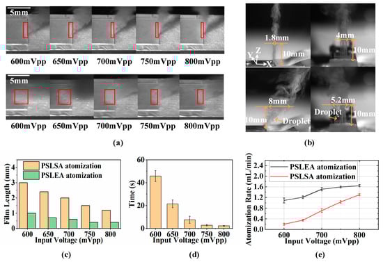 Based on the atomization process of deionized water under the two atomization modes, the different atomization performances mainly originate from the morphology and dimensions of the liquid film at the front end of the paper strip. These characteristics directly influence the atomization efficiency, particle size distribution, atomization form, and stability. The following analysis investigates the atomization performance under different input power conditions, in which the input voltage range is set between 600 mV and 800 mV to ensure typical liquid atomization in both modes effectively. As shown in Figure 3a, the upper and lower rows of the images depict the morphological changes in the liquid film at the front end of the paper strip when the PSLEA and PSLSA atomization reaches stable atomization under different input voltages, respectively. The red rectangular boxes highlight the liquid film area. Here, the dimension of the liquid film along the acoustic wave propagation direction is defined as the liquid film length, and the dimension along the IDT electrode is defined as the liquid film width. The results show that the liquid film width is essentially consistent with the IDT aperture, while the liquid film length distribution differs significantly between modes. As shown in Figure 3c, the liquid film length distribution under different input voltages shows that the liquid film length gradually decreases with increasing input power in both atomization modes. When the input voltage increases from 600 mV to 800 mV, the liquid film length in the PSLSA mode decreases from about 3 mm to 1.2 mm, whereas that in the PSLEA mode decreases from about 1 mm to 0.4 mm. Notably, the liquid film length in the PSLEA mode is reduced by half compared to the PSLSA mode under the same input power. On the one hand, the SAW energy also increases with input power. The enhanced acoustic force generates a volume flux in the fluid along the direction of acoustic radiation, which acts on the liquid membrane and pushes it toward the paper strip, thereby promoting film contraction. On the other hand, the expansion of the liquid film under acoustic wetting is partially constrained by gravity. When the liquid is located at the edge of the atomizer, the expansion speed of the liquid film is further restricted by gravitational pull and acoustic wave attenuation at the edge, which more effectively drives liquid film length contraction.