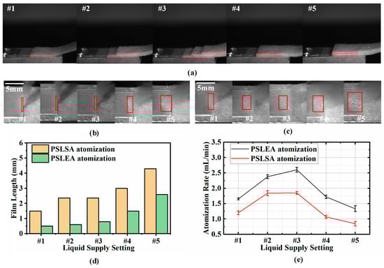 The influence of five different combinations of paper strips for liquid supply on atomization performance. (a) A schematic diagram of the paper strip combination for liquid supply, (b) a feature image of the liquid film at the atomization zone under PSLEA atomization, (c) a feature image of the liquid film at the atomization zone under PSLSA atomization, (d) the distribution of liquid film lengths, (e) the distribution of atomization rates. The red lines describe the thickness contour of the liquid supply paper strip positioned on the atomizer surface. The red rectangular boxes indicate the liquid film area at the front end of the paper strip.