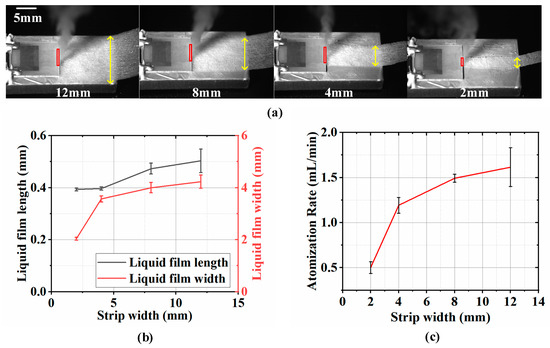 The influence of the liquid supply width of the paper strips on atomization performance. (a) A schematic diagram of the liquid supply for PSLEA atomization using a single-layer paper strip with four different widths, (b) the liquid film length and width varies with the paper strip width, and (c) the atomization rate varies with the paper strip width. The red rectangular boxes indicate the liquid film area at the front end of the paper strip. The yellow lines with double arrows denote the width of the liquid supply paper strip.