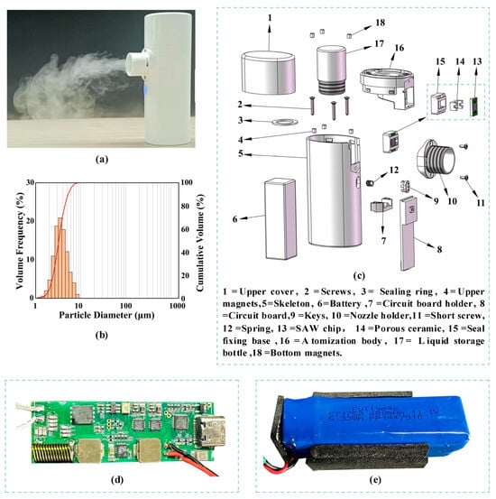 Handheld portable SAW atomizer based on the PSLEA atomization method. (a) A physical map of the SAW atomizer, (b) the particle size distribution of atomized aerosol in deionized water, (c) a structure-exploded view of the SAW atomizer, (d) the driving circuit board, and (e) a battery.