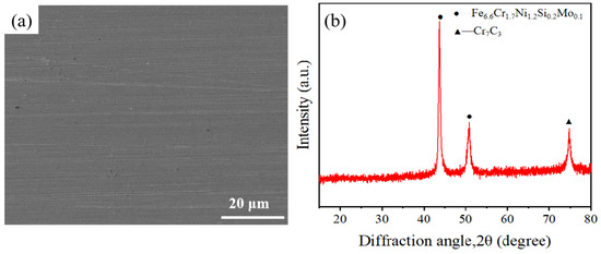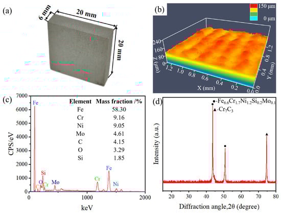 The SLM-316L stainless steel samples with dimensions of 20 × 20 × 6 mm were provided by Xiamen Wuxinglong Technology Co., Ltd. (Xiamen, China). as shown in Figure 1a. The initial average surface roughness (Sa) of the sample was 7.912 μm, as presented in Figure 1b. The elements of SLM-316L stainless steel are characterized by energy-dispersive spectroscopy (EDS), and the results are displayed in Figure 1c. EDS analysis shows that the elemental composition in weight percentage (wt%) of SLM-316L stainless steel was Fe 58.30%, Cr 9.16%, Ni 9.05%, Mo 4.61%, C 4.15%, O 3.29%, and Si 1.85%. Clearly, the most dominant element in SLM-316L stainless steel is Fe. It is worth noting that the presence of the O element is from the atmosphere. The X-ray diffractogram (XRD) spectrum of the initial SLM-316L stainless steel is shown in Figure 1d. The diffraction peaks at 2θ of 43.66° and 50.82° correspond to Fe6.6Cr1.7Ni1.2Si0.2Mo0.1 according to PDF No. 50-1293. The diffraction peak located at 2θ = 74.72° corresponds to Cr7C3 (PDF No. 11-0550). This indicates that the original SLM-316L stainless steel is composed of Fe6.6Cr1.7Ni1.2Si0.2Mo0.1 and Cr7C3.