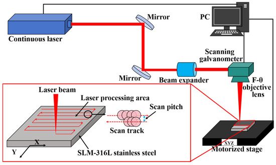 Before laser processing experiments, SLM-316L stainless steel was ultrasonically cleaned in anhydrous ethanol for ten minutes and then dried with nitrogen. The SLM-316L stainless steel sample was then mounted on a computer-controlled X-Y-Z stage. The laser processing equipment is provided by Century Raymond (Beijing) Technology Co., Ltd. (Beijing, China). The laser source is a nanosecond laser with a working wavelength of 1064 nm, a pulse duration of 2 ns, a repetition rate of 850 kHz, and a maximum power of 20 W. As illustrated in Figure 2, the nanosecond laser beam is first guided by two mirrors into a beam expander and then goes into the galvanometer scanner, and finally focuses normally onto the SLM-316L stainless steel surface through an F-Theta objective lens with a focal length of 160 mm. The focused laser spot diameter is 60 μm. The laser scanning track is shown in the bottom left of Figure 2. The laser processing is performed in an atmospheric environment. In order to verify the repeatability of the test results, a total of three repeatability verification tests were conducted.
