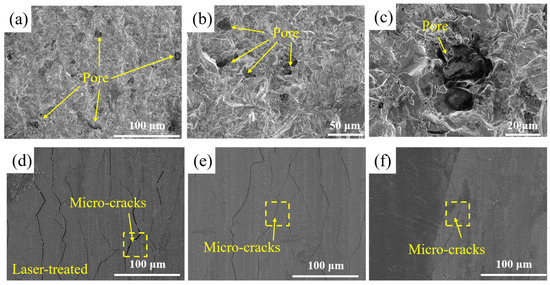 Surface micro-morphologies of (a–c) original and (d–f) laser-treated SLM-316L stainless steel.