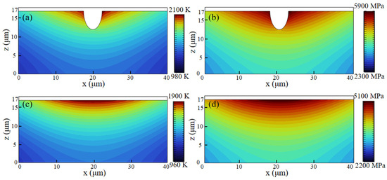 Temperature field and thermal stress distribution of laser irradiation of SLM-316L stainless steel (a,b) with a defect and (c,d) without a defect at 140 μs.
