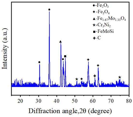 In order to determine whether the surface of SLM-316L stainless steel after laser processing contains metal oxides, we performed XRD inspection, and the results are shown in Figure 7. The diffraction peaks located at 2θ = 30.54°, 35.94°, and 43.64° correspond to Fe2O3 according to PDF No. 25-1402. The diffraction peaks located at 2θ values of 53.96°, 57.52°, and 63.00° correspond to Fe3O4 (PDF No. 26-1136). The diffraction peaks at 2θ values of 42.26° correspond to Fe1.67Mo1.33O4 (PDF No. 42-0324). This confirms that large amounts of iron oxides were produced on the surface of SLM-316L stainless steel after laser processing. In addition, the diffraction peaks located at 51.18° and 74.96° correspond to Cr3Ni2 (PDF No. 26-0430). The two diffraction peaks at 2θ values of 44.80° and 61.10° correspond to FeMoSi and C, respectively (PDF Nos. 15-0485 and 46-0944). This indicates that the material composition of laser-processed stainless steel consists of Cr3Ni2, FeMoSi, and C in addition to metal oxides.