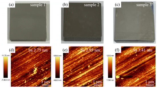 (a–c) Optical photographs and (d–f) AFM images of three SLM-316L stainless steel samples after mechanical grinding.