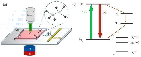 Schematic of the experimental setup and diamond NV level structure. (a) A diamond with NV centers is placed on a thulium iron garnet (Tm3Fe5O12, thickness: 20 nm) thin film. A 532 nm green laser with a power of 0.8 mW is used, and red fluorescence is collected through the same objective. Microwave (MW) radiation is generated through a microwave line, and a neodymium iron boron permanent magnet provides the external magnetic field. Inset: atomic structure of the NV centers in the diamond; (b) initialization and readout of the NV spin are achieved through green laser excitation and red photoluminescence (PL) detection. There are two pathways for returning from the excited state to the ground state: one is direct radiative fluorescence to the ground state, and the other is returning to the ground state through an intermediate state without radiating fluorescence. The electronic spin ground state of the NV center is a triplet with spin quantum numbers ms = 0 and ms = ±1.