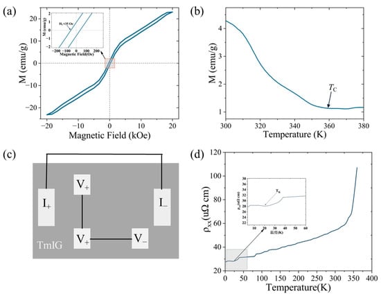 After confirming the high structural quality and compositional uniformity of the TmIG thin films, we systematically investigated their key magnetic and electrical transport properties. As shown in Figure 3a, the M-H loop measured at 300 K displays a hysteresis loop, with a coercivity of 35 Oe. These features demonstrate robust ferromagnetism and strong perpendicular magnetic anisotropy, which are both attributable to the optimized fabrication process and a uniform magnetic domain structure with minimal pinning.