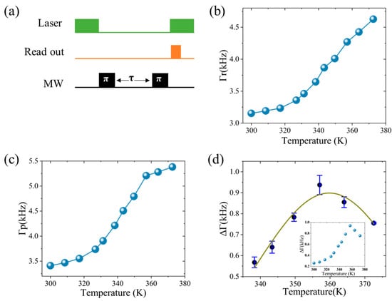 Figure 5a illustrates the employed T1 pulse sequence. We measured relaxation at both a probe location adjacent to the TmIG surface and at a remote reference under a constant external magnetic field. As shown in Figure 5b,c, the relaxation rate at the reference site (ΔΓr) increases moderately with temperature, consistent with phonon-mediated relaxation. At the probe site (ΔΓp), however, a pronounced peak appears near the Curie temperature (~360 K), significantly surpassing the reference values.