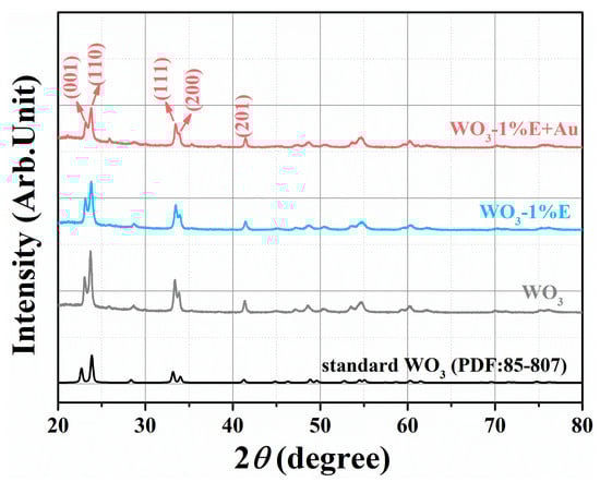 The crystalline phases of all the samples were characterized by XRD. In Figure 1, the diffraction peaks of WO3 can be categorized as monoclinic WO3 (PDF: 85-807) with lattice parameters of a = 7.297 nm, b = 90.91 nm, and c = 7.688 nm. No impurity phases were detected, implying that the material is of high purity. For the WO3-1%E+Au sample, there was no diffraction peak corresponding to the Au element due to the low addition of Au (1 mol%). According to the Debye-Scherrer formula, the grain sizes of all samples are approximately 34.73 nm, 24.36 nm, and 26.21 nm [33]:
