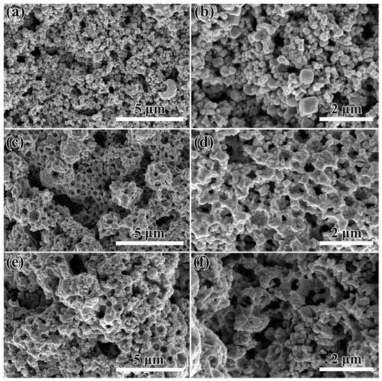 WO3-1%E samples with uniform macroporous structure were obtained after the addition of etchant NaHCO3 to the reaction solution (Figure 2c,d and Figure S2). This may be attributed to the fact that NaHCO3, as a strong alkaline and weakly acidic etchant, dissolves and binds the boundaries of independently grown WO3 nanoparticles to each other, encapsulating the carbon sphere templates. After removing the carbon spheres by sintering, the porous structured WO3 consisting of boundary fuzzy particles was finally obtained (Figure 2d). The SEM images of the WO3-1%E+Au samples are shown in Figure 2e,f. The morphology of the samples was not much affected by the introduction of chloroauric acid, and the particle morphology of the samples still maintained a uniform porous structure.