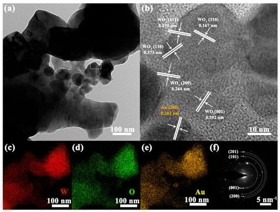 TEM and HRTEM measurements were used to analyze the morphology and structure of the WO3-1%E+Au sample. As shown in Figure 3a, the sample was formed by the accumulation of particles. Figure 3b shows the HRTEM image within the white dashed box in Figure 3a, where the crystal spacing corresponding to the WO3 (111), (310), (110), (200), and (001) crystal planes and the Au (200) crystal plane can be clearly observed. In addition, the EDS (Energy Dispersive X-ray Spectroscopy) maps in Figure 3c–e show the distribution of tungsten (W), oxygen (O), and small amounts of gold (Au) in the WO3-1%E+Au sample. It can be seen that the Au element is uniformly distributed in the WO3 sensitive matrix. Figure 3f shows a typical pattern of WO3 where characteristic monoclinic reflections are observed, corresponding to the (201), (101), (200), and (201) crystal planes of WO3.