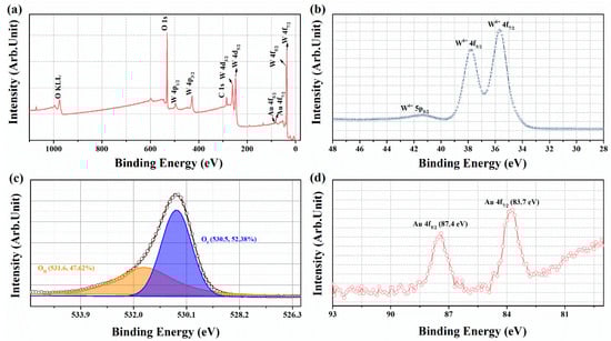 XPS detection was used to determine the chemical valence states of the elements in the samples. For the WO3-1%E+Au sample, a wide scan XPS spectrum was obtained between 0 and 1100 eV (Figure 4a), and the peaks were observed matching the elements C, W, O, and Au. The XPS measurements were calibrated using the characteristic carbon peak (C 1s) with a binding energy of 284.8 eV. In the XPS spectrum (Figure 4b), the peaks matching the W element can be observed at binding energies of 41.3 eV, 37.8 eV, and 35.7 eV, corresponding to W6+ 5p5/2, W6+ 4f5/2, and W6+ 4f7/2 [38,39].