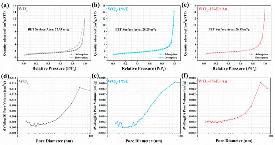 The measured BET surface areas of WO3, WO3-1%E, and WO3-1%E+Au are 22.03, 28.25, and 26.55 m2/g, respectively (Figure 5a–c). All N2 adsorption-desorption isotherms showed typical IV isotherms with hysteresis loops in the high relative pressure range [44]. The pore size distribution curves of all samples separately are shown in Figure 5d–f. The BJH pore size distribution curves all peaked around 50 nm, indicating that both samples have microporous structures. These microporous structures are due to the stacking of WO3 particles, which is favorable for the transmission of the detected gas and contact with the sensing material.