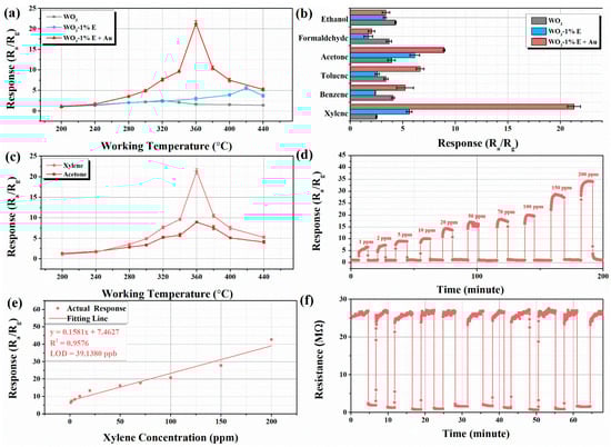 Figure 6a shows the response values of all sensors to xylene at different operating temperatures. All sensors showed a tendency to increase and then decrease as the operating temperature increased. Compared with other sensors, WO3-1%E+Au had the highest response value of 21.3 to 100 ppm xylene at the optimum working temperature of 360 °C. In addition, the gas-sensitive properties of WO3 etched with different concentrations of NaHCO3 and decorated with different amounts of Au to xylene were analyzed, as shown in Figures S5 and S6. The results showed that 1% NaHCO3 and 1% Au was the optimal ratio when the sensor obtained the best sensing performance to xylene.