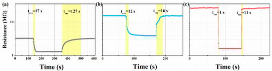 The devices were evaluated in a static system in a 1 L test chamber under controlled conditions of 25 °C and 30 ± 5% relative humidity. The working temperature of the device was adjusted by an internal heating resistance wire. The output resistance of the device was continuously monitored using a digital resistance meter (Fluke 8846A). The resistance of the sensor stabilized in the air environment, at which point the resistance value was marked as Ra. A liquid corresponding to the concentration of the test gas was withdrawn using a micro-syringe [30,31], injected into the 1 L test chamber, and mixed homogeneously with air. The sensor was then placed into the test gas chamber. After the resistance of the sensor in the test chamber stabilized, the resistance value was marked as Rg. Finally, the sensor was placed into a clean air chamber to return the resistance value to its initial state. The response of the gas sensor to the target gas is identified as the ratio (Ra/Rg) between the resistance in air (Ra) and the resistance value in the target gas (Rg). The response time (tres) and recovery time (trec) of the sensor are determined based on the time required for the sensor to reach 90% of the total change in resistance exposed to the target gases and fresh air, respectively [32].