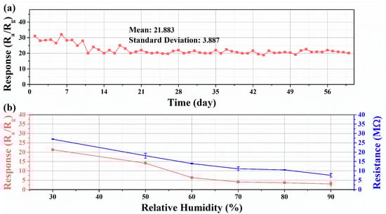 The WO3-1%E+Au sensor was tested continuously for 60 days under laboratory conditions to figure out the long-term stability. The variation of the response value with time was plotted in Figure 8a. The response values of the sensor fluctuated slightly in the first 20 days but gradually stabilized over time. There is no significant decay in the response value during the measurement. The mean and standard deviation of the response values within 60 days were calculated to be 21.883 and 3.887, respectively, indicating that the sensor can be used for xylene detection in practical situations and the sensing performance remains stable [47].