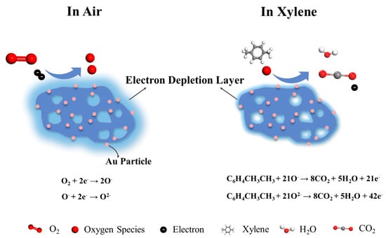 Upon exposure to a reducing gas such as xylene, the xylene molecules will interact with the oxygen species adsorbed on the surface and release the captured electrons back into the conduction band. This results in a decrease in the thickness of the electron depletion layer, an increase in conductivity, and a corresponding decrease in sensor resistance. The reaction between xylene and oxygen species can be expressed by the following formulas [53]: