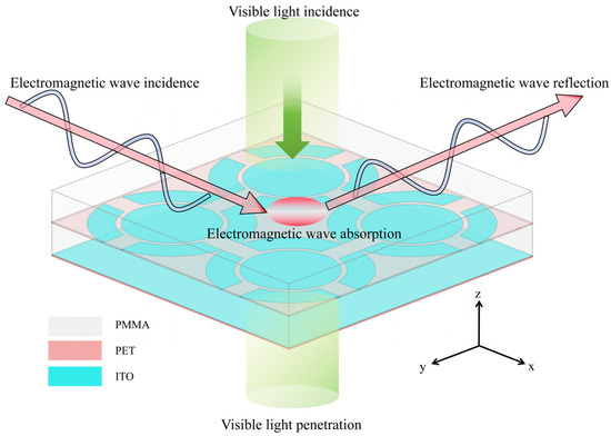 As early as 2008, Landy, N.I. et al. proposed an MMA based on metal units and FR4 dielectric plates, which achieved near-perfect absorption at an operating frequency of 11.48 GHz, and since then, MMA has attracted a lot of attention [11]. In 2009, Zadeh, A.K. et al. proposed a fast method for designing wave absorbers based on ECM [12]. In 2019, Xie, J et al. designed an all-dielectric MMA to achieve 0–45° angular domain absorption for two polarization waves [13]. In addition, the rapid development of hypersurface technology provides new ideas for MMA design [14,15]. Zheng, C.-L. et al. designed a multifunctional hypersurface for polarization multiplexing by jointly regulating the propagation phase and the geometric phase. This study demonstrated the flexible ability of the hypersurface to regulate the phase, polarization, and energy of electromagnetic waves, and its design concept is also applicable to the optimization of MMA [16]. The above designs have contributed to the development of MMA, but the use of opaque metals and dielectrics has made these designs difficult to apply where high optical transparency is required.