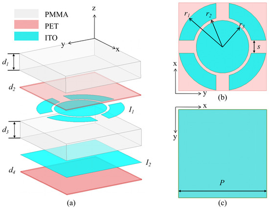 Figure 2a demonstrates the four-layer symmetric-structure absorber unit designed in this study, where the symmetric nature of the unit pattern gives the structure the advantage of polarization insensitivity. In order to realize the synergistic design of broadband wave absorption and optical transparency, PMMA with dielectric constant ε1 = 3.05 − j0.0305 is selected as the transparent dielectric plate for the first and third layers. The second-layer structure is shown in Figure 2b, where an ITO thin film pattern with a surface resistance I1 = 80 Ω/sq is prepared by an etching process on a highly transparent PET substrate with a dielectric constant ε2 = 3 − j0.18 to form a lossy layer. The fourth layer adopts a highly conductive ITO film (I2 = 6 Ω/sq) to replace the traditional metal reflector plate, the top view of which is shown in Figure 2c, to ensure the electromagnetic wave reflecting performance while maintaining the optical transparency characteristics.