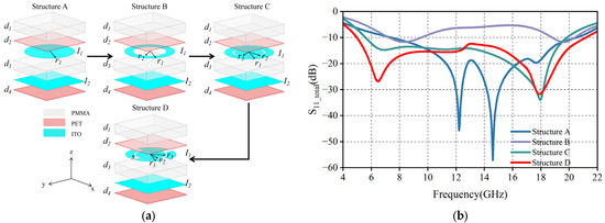 Figure 3. (a) MMA unit evolution process; (b) Reflection coefficients for different unit structures.