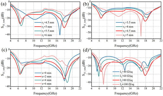 Figure 4. Reflection coefficients corresponding to different unit parameters of MMA. (a) Reflection coefficients for different r2 conditions; (b) Reflection coefficients for different r3 conditions; (c) Reflection coefficients for different s conditions; (d) Reflection coefficients for different I1 conditions.