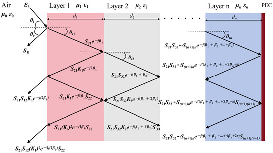 In this study, due to the design of multilayer dielectric structures, the above interference theory needs to be extended to multilayer systems. Figure 5 illustrates the propagation of electromagnetic waves in a multilayer medium, whose total reflection coefficient S 11 _ total can be calculated by Equation (2):