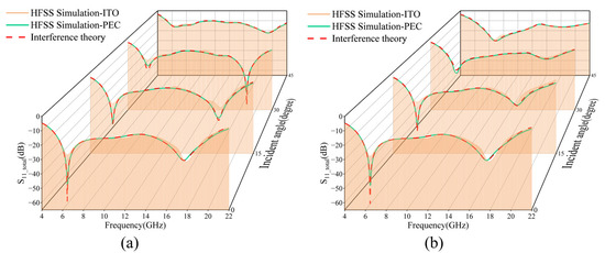Figure 6. Comparison of HFSS Simulation and Interference theory results. (a) TM polarized wave 0–45° reflection coefficient; (b) TE polarized wave 0–45° reflection coefficient.