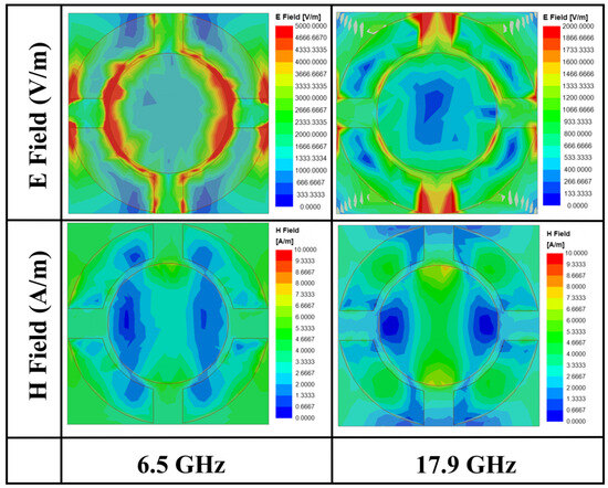 Figure 7. Simulated electric and magnetic field distributions at 6.5 GHz and 17.9 GHz.