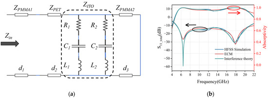 In order to further verify the correctness of the interference theory, we analyze it in comparison with the theoretical values of ECM. By analyzing the simulated electromagnetic field distribution on the surface of the ITO film at the resonance points (6.5 GHz and 17.9 GHz), the loss mechanism of the absorber can be deeply analyzed to construct the EMC. As shown in Figure 7, at 6.5 GHz and 17.9 GHz, the electric field energy is highly concentrated at the edge of the inner and outer rings and the slit region, indicating that the equivalent capacitance is formed here due to charge aggregation. The magnetic field is mainly concentrated in the outer annular ring arms, as well as in the center region of the inner circle, whose time-varying properties induce an equivalent inductance. The synergistic effect of the above electric and magnetic fields can be modeled as a second-order R-L-C resonant circuit. Based on the transmission line theory, the PMMA layer and the PET layer can be equated to a transmission line with characteristic impedances of ZPMMA and ZPET, and the constructed EMC is shown in Figure 8a.