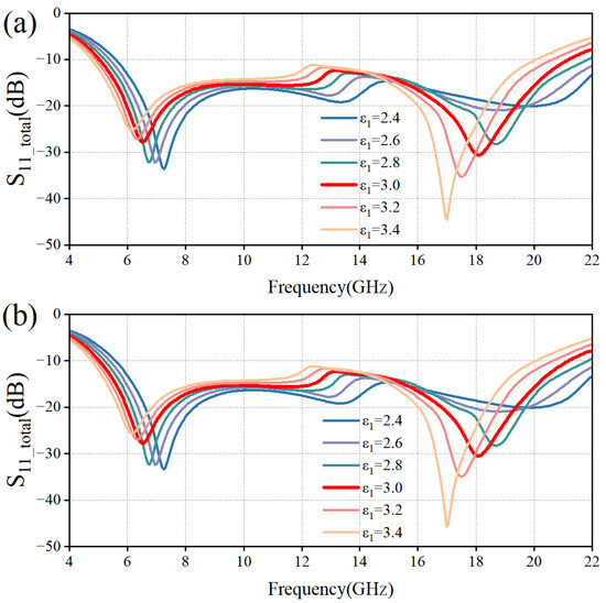 Based on the multilayer interference theory, it is known that the dielectric constant ε and the thickness d of the dielectric layer are two key parameters affecting the performance of the absorber. Since the sub-wavelength thickness of the PET layer has less influence on the phase of electromagnetic wave propagation, we mainly analyze the influence of electromagnetic parameters and the thickness of the PMMA layer on the performance of the absorber. Based on the HFSS simulation data in Figure 9, it can be seen that the two resonance points are gradually shifted to lower frequencies as ε1 gradually increases. Based on the HFSS simulation data in Figure 10, it can be seen that, keeping d3 constant, the resonance points at high frequencies are gradually formed as d1 increases, and the two resonance points are gradually shifted to low frequencies. Keeping d1 constant, as d3 increases, the resonance point at the high frequency first forms and then disappears, and the resonance point at the low frequency is similarly shifted to the low frequency. When both d1 and d3 are 3 mm, both resonance points are formed and the −10 dB bandwidth is more desirable, which proves that at this time, the electromagnetic wave occurs many times in the internal interference phase cancellation of the absorber. Meanwhile, the high similarity between the TM polarization wave and TE polarization wave results verifies that the designed MAA is insensitive to polarization.