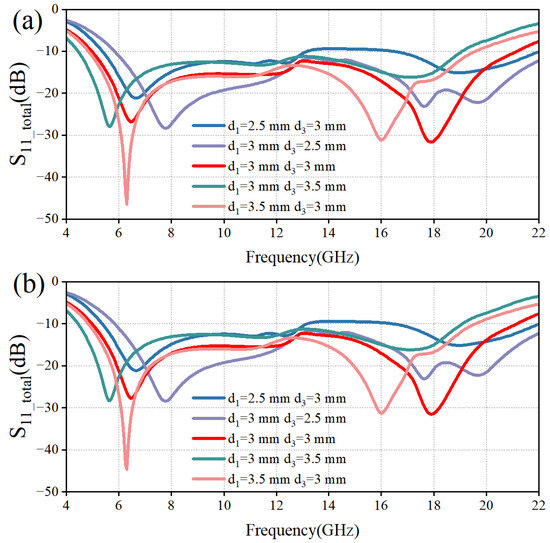 In order to deeply investigate the modulation mechanism of MMA unit structure parameters on the electromagnetic wave reflection characteristics, we systematically analyzed the reflection coefficients under different parameter conditions based on ANSYS HFSS 2020R2. Figure 4a,b demonstrate the pattern of the radius parameters r2 and r3 on the reflection coefficient, respectively. As r2 gradually decreases from 6 mm to 5 mm, the width of the central annular slit decreases accordingly, leading to a significant increase in the depth of reflection at both resonance points. This phenomenon suggests that a moderate narrowing of the gap can effectively enhance the local coupling effect of the electromagnetic field. It is worth noting that an increase in r3 is physically equivalent to a decrease in r2, and thus the two are consistent in their mechanisms of modulation of MMA performance. When r2 = 4.5 mm, the intermediate gap is completely closed, at which time the structural properties are similar to those of structure A in Figure 3a, with the low-frequency resonance point gradually shifted to the high frequency and the reflection depth reduced. After comprehensive optimization, we finally selected r2 = 5 mm and r3 = 4.5 mm as the best parameter combination.