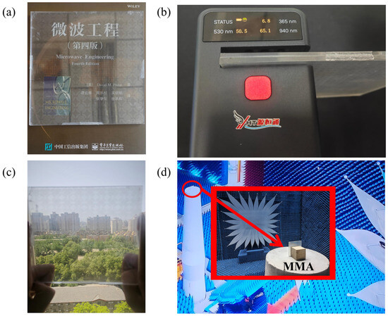Figure 11. (a) Transparent MMA samples; (b) Schematic diagram of MMA single-point light transmittance test; (c) Schematic diagram of MMA light transmittance under sunlight; (d) MMA microwave darkroom test chart (The red box is a partial enlarged image).