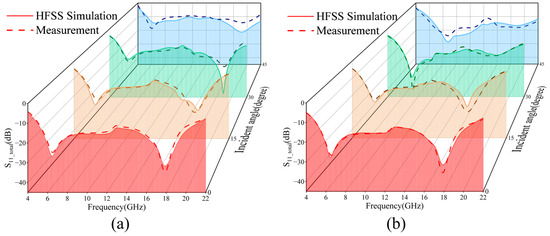 Figure 12. Simulation and experimental results of transparent wave absorber. (a) TM polarized wave 0–45° reflection coefficient; (b) TE polarized wave 0–45° reflection coefficient.