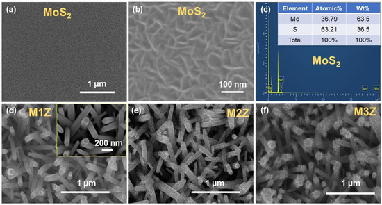 FESEM images of (a,b) MoS2 thin films and (c) the EDX spectrum of a MoS2 thin film. FESEM images of MoS2/ZnO heterostructures for samples (d) M1Z, (e) M2Z, and (f) M3Z, respectively.