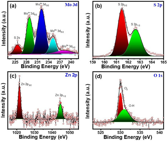 High-resolution XPS spectra of M3Z for (a) Mo 3d, (b) S 2p, (c) Zn 2p, and (d) O1s, respectively.