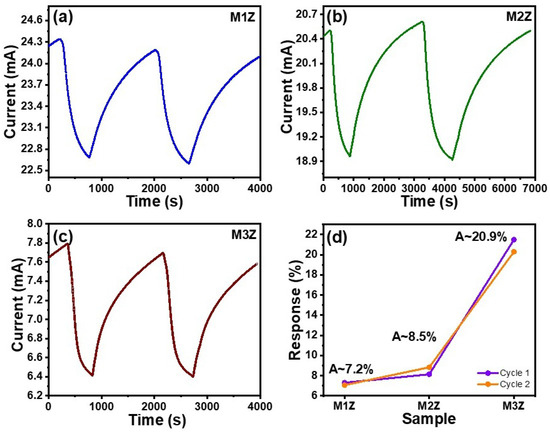 The current–voltage (I–V) characteristics of the MoS2/ZnO heterostructures with varying MoS2 sputtering times (M1Z, M2Z, and M3Z) were recorded under a bias voltage range of −5 V to +5 V (Figure 3b). All samples exhibit a linear I–V relationship, indicating ohmic contact behavior. However, the current decreases progressively with increasing sputtering time, with M1Z showing the highest current and M3Z the lowest. This decline in current can be attributed to the increasing thickness of the MoS2 layer, which may act as a barrier to charge transport by increasing resistance and limiting carrier mobility across the heterojunction. The denser MoS2 coverage at longer deposition times could also reduce the number of active charge transfer pathways between MoS2 and ZnO.