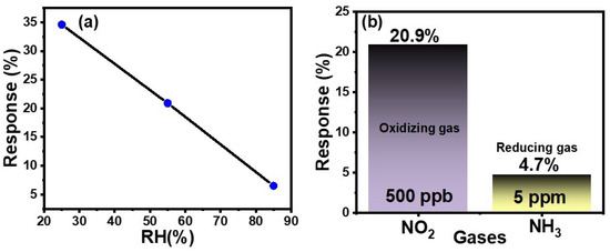 (a) Gas-sensing response of the M3Z sensor under varying relative humidity conditions (25%, 55%, and 85%). (b) Selectivity analysis toward NO2 (500 ppb) and NH3 (5 ppm).