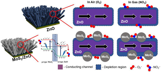 The gas-sensing mechanism of sputtered MoS2/ZnO heterostructures toward NO2 primarily relies on the modulation of charge carrier concentration at the interface of the p–n heterojunction formed between p-type MoS2 and n-type ZnO (Figure 6). When these two materials are combined, electrons from ZnO diffuse into MoS2 and holes from MoS2 diffuse into ZnO until their Fermi levels align, leading to the formation of a depletion region at the interface. This built-in electric field facilitates charge separation and enhances the sensitivity of the heterostructure. In air, oxygen molecules adsorb on the surface of the heterostructure and capture free electrons from ZnO, forming ionized oxygen species (O2−), which further widen the depletion layer and decrease conductivity.