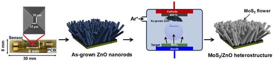 The electrodes were fabricated on a thermally oxidized silicon wafer using standard photolithography, electron-beam (e-beam) evaporation, and lift-off techniques. The interdigitated two-finger electrodes consist of a Ti (15 nm)/Au (300 nm) bilayer. The channel gap between the electrodes is 15 µm, which defines the active sensing region where the MoS2/ZnO composite was deposited. The growth of ZnO nanorods was realized by a hydrothermal method in our previous work [15]. The MoS2 target (2” diameter) with high purity (99.99%) was purchased from Ultimate Materials Technology Co., Ltd., (UMAT), Hsinchu, Taiwan. The base pressure of the sputtering chamber was maintained at approximately 1 × 10−6 Torr. Sputtering was performed using a DC power of 20 W in an argon atmosphere at a working pressure of 5 × 10−3 Torr [27]. MoS2 films were deposited at a substrate temperature of 400 °C with an Ar flow rate of 40 sccm. The film thickness was controlled by varying the deposition time to 2.5, 5, and 25 min, respectively. The resulting samples were labeled M1Z, M2Z, and M3Z, corresponding to the increasing deposition durations. The approximate deposition rate for our MoS2 film was around 2 nm/min. The schematic representations of the synthesis of MoS2/ZnO heterostructures are shown in Scheme 1.
