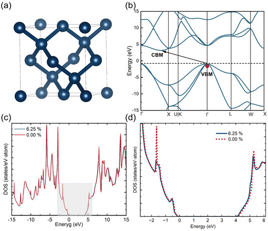 Electronic structure of diamond. (a) Crystal structure of diamond. (b) Electronic band structure of pristine diamond calculated using the PBE functional, with the excitation mechanism indicated. (c) Total density of states (DOS) for the ground state and the excited state (6.25%). (d) Enlarged view of the density of states near the valence band maximum (VBM) and conduction band minimum (CBM). The results show that the bandgap decreases with increasing electronic excitation, accompanied by a reduction in electron occupation in the valence band and an increase in electron population in the conduction band.