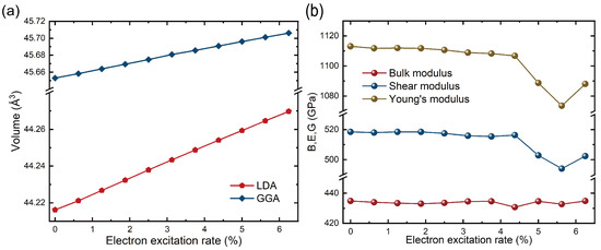 (a) Relationship between unit cell volume and electronic excitation calculated using LDA and GGA functionals. (b) Variation trends of the bulk modulus (B), shear modulus (G), and Young’s modulus (E) of diamond with increasing electronic excitation, aiming to reveal the influence of electronic excitation on its elastic properties.
